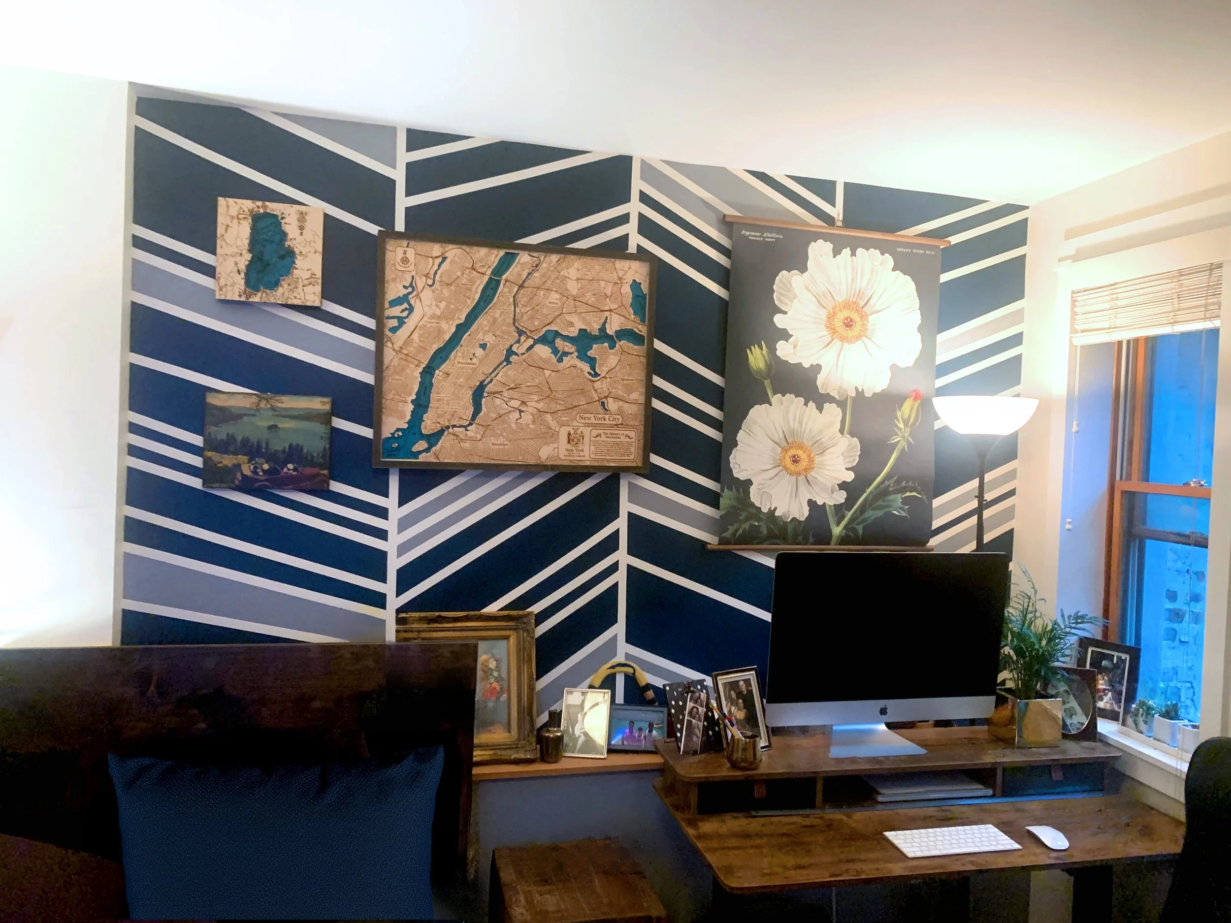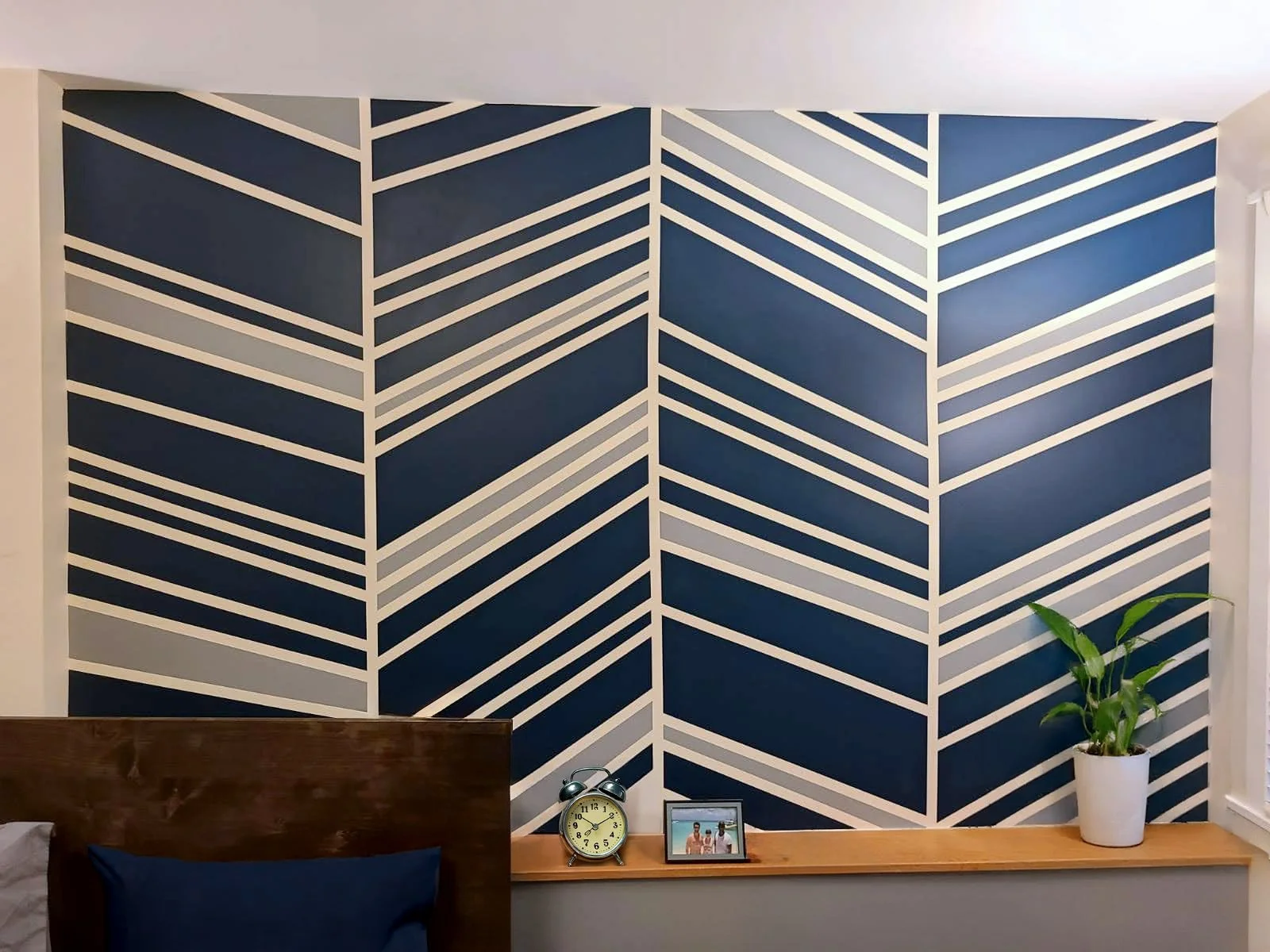 This custom mural was designed to bring a masculine yet creative touch to the client’s bedroom. Using deep navy blue and soft gray tones, the bold chevron stripe pattern adds movement and depth, making the space feel dynamic yet sophisticated. The design complements the room’s warm wood tones and industrial elements, striking the perfect balance between strength and artistry.